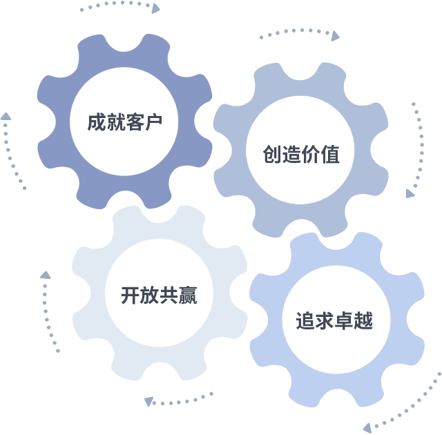 成就客户是一切决策的出发点,,,,创造价值是衡量所有工作的标准,,追求卓越是我们做事做人的态度,,开放共赢是我们的格局也是最终的结果。。。价值观的齿轮环环相扣,,推动着组织里的每个人不断向前。。。。